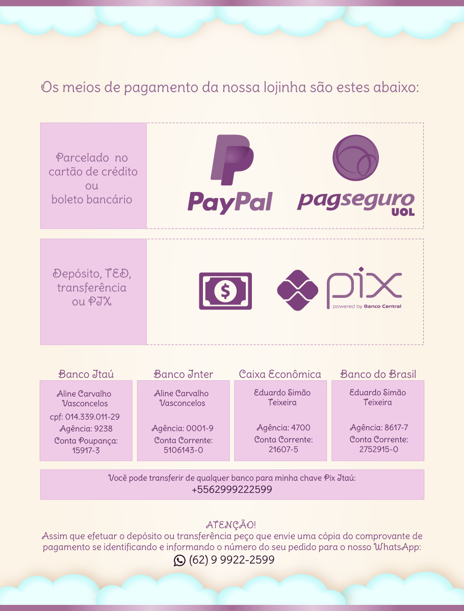 O Ateliê Aline Vasconcelos – Arte em Biscuit trabalha com pagamento via PIX, depósito bancário, transferência, além das plataformas PagSeguro e PayPal. Os dados necessários para efetuar o pagamento por PIX, depósito ou transferência são exibidos no fechamento do pedido e também podem ser conferidos na imagem disponível abaixo. Para qualquer dúvida ou orientação, entre em contato conosco pelo WhatsApp ou e-mail.